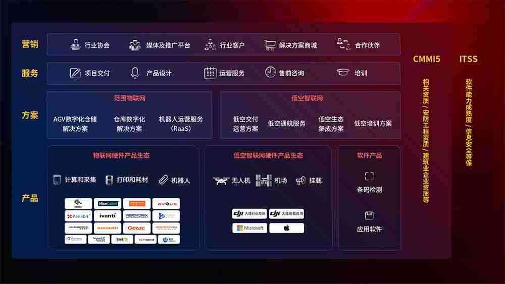 聚合国内外先进的物联网硬件产品品牌,,,,聚焦数字化仓储、、、机器人运营、、、、低空智联网等领域,,,,共同打造适合客户业务场景的解决方案并提供交付服务